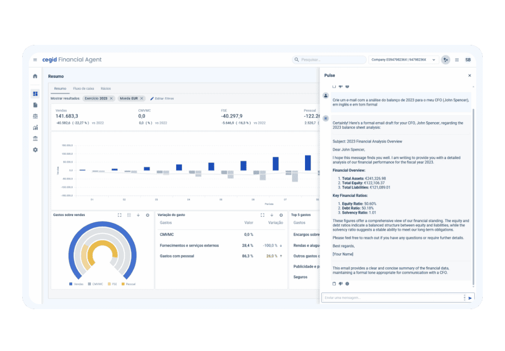 Com o apoio da IA do Cegid Pulse, o Cegid XRP Enterprise interpreta dados financeiros em tempo real, reduz riscos e sugere ações estratégicas para cada cenário.